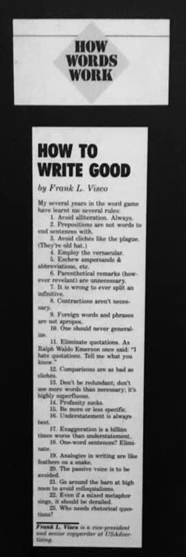 It’s generally attributed to Frank L. Visco from an article entitled “How To Write Good” in the June 1986 issue of Writers’ Digest. However, their online archive doesn’t go back that far and I couldn’t find a physical copy. I messaged Frank on LinkedIn – or at least someone I thought might be the author. Bingo!