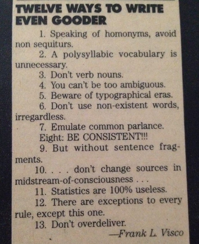 Amusingly, he also sent me another 13 rules entitled “12 Ways To Write Even Gooder”. Those additional rules: